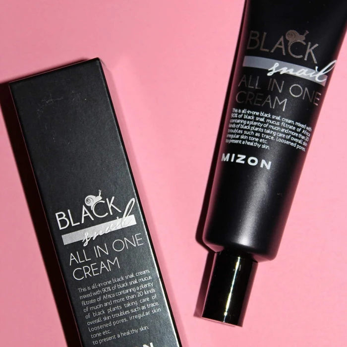 Mizon Black Snail All In One Cream — крем премиум-класса содержит 90% фильтрата секрета черной африканской улитки и экстракты 20 различных черных растений. Гигантские африканские улитки (ахатины) могут впадать в спячку на 6 месяцев, в их организме накоплен большой запас питательных веществ, и поэтому действие секрета африканских черных улиток эффективнее, чем обычных садовых.