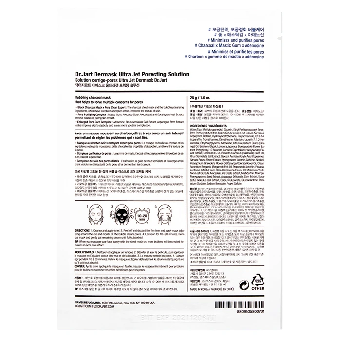 Маска Dr.Jart+ Dermask Ultra Jet Porecting Solution поможет не только качественно завершить этап очищения и сузить поры, но и комплексно оздоровить кожу. Пузырьковая формула улучшает клеточное дыхание, выравнивает тон и дарит вашему лицу свежий отдохнувший вид. Стоит заказать маску, если вы ищете натуральное средство для сужения и очищения пор, которое не содержит вредных химических компонентов и аллергенов.
