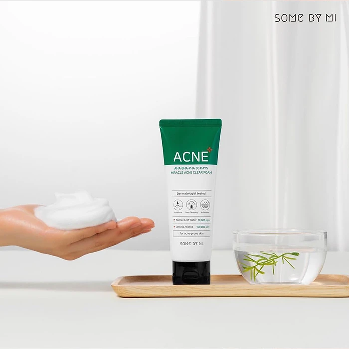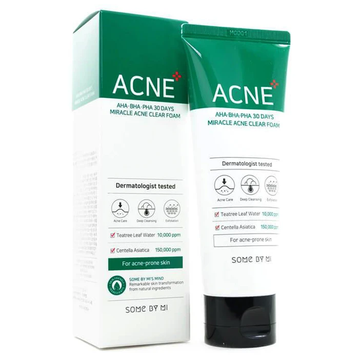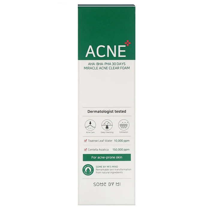Очищающая пенка для проблемной кожи SOME BY MI AHA-BHA-PHA 30 Days Miracle Acne Clear Foam с комплексом кислот и растительных экстрактов мягко и деликатно очищает кожу, удаляет все загрязнения, остатки макияжа, излишки кожного сала и шелушения. Направлена на обновление кожного покрова, ускоряет заживление воспалений, успокаивает раздражённую кожу и выравнивает тон.
