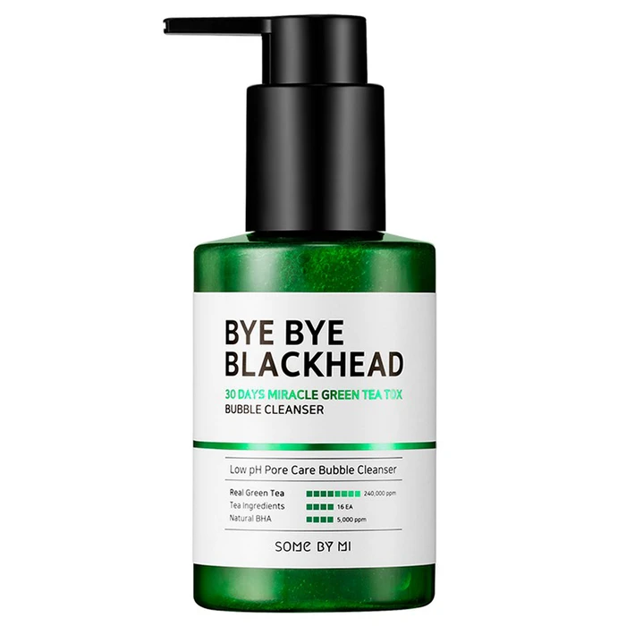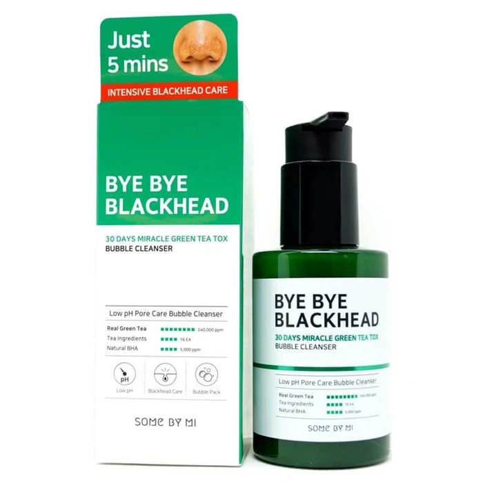 Маска-пенка с ВНА-кислотой SOME BY MI BYE BYE BLACKHEAD 30 Days Miracle Green Tea Tox Bubble Cleanser, которая сама вспенивается после нанесения и помогает растворить черные точки и очистить поры.