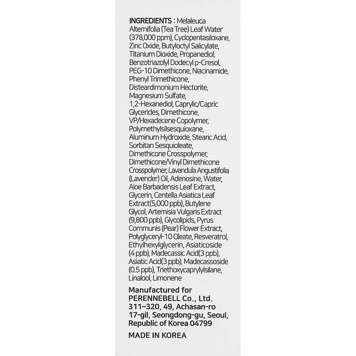 Tea Tree Leaf Hydrolate (378,000 Ppm), Cyclopentasiloxane, Zinc Oxide, Butyloctyl Salicylate, Titanium Dioxide, Propanediol, Benzotriazolyl Dodecyl P-cresol, Peg-10 Dimethicone, Niacinamide, Phenyl Trimethicone, Disteardimonium Hectorite, Magnesium Sulfate, 1,2-hexanediol, Caprylic/capric Triglycerides, Dimethicone, Vp/hexadecene Copolymer, Polymethylsilsesquioxane, Aluminum Hydroxide, Stearic Acid, Sorbitan Sesquioleate, Dimethicone Crosspolymer, Dimethicone/vinyl Dimethicone Crosspolymer, Lavender Oil, Adenosine, Water, Aloe Vera Leaf Extract, Glycerin, Centella Asiatica Extract (5000 Ppb), Butylene Glycol, Wormwood Extract (9800 Ppb), Glycolipids, Pear Extract, Polyglyceryl-10 Oleate, Resveratrol, Ethylhexylglycerin, Asiaticoside (4ppb), Madecassic Acid (3 Ppb), Asiatic Acid (3 Ppb), Madecassoside (0.5 Ppb), Triethoxicaprilylsilane, Linalool, Limonene