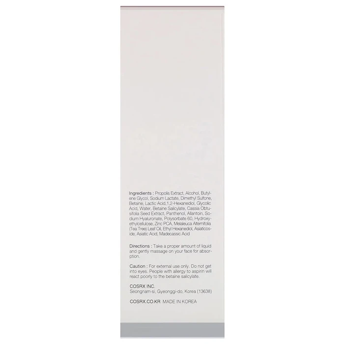 Propolis Extract, Alcohol, Butylene Glycol, Sodium lactate, Dimethyl Sulfone, Betaine, Lactic Acid,1,2-Hexanediol, Glycolic Acid, Water, Betaine Salicylate, Cassia Obtusifolia Seed Extract, Panthenol, Allantoin, Sodium Hyaluronate, Polysorbate 60, Hydroxyethylcellulose, Zinc PCA, Melaleuca Alternifolia (Tea Tree) Leaf Oil, Ethyl Hexanediol, Asiaticoside, Asiatic acid, Madecassic acid.