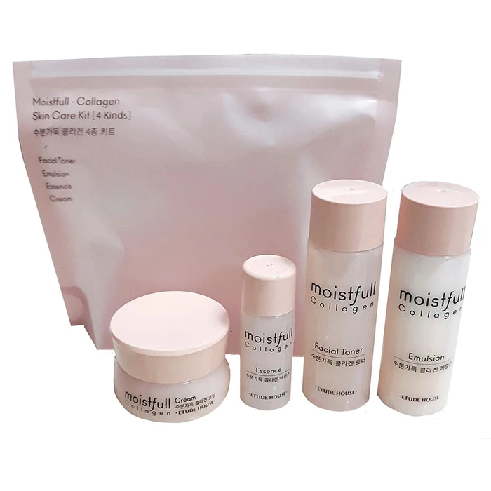 Набор миниатюр средств от южнокорейского бренда ETUDE HOUSE Moistfull Collagen Skin Care Kit, в который входят тоник, крем, эмульсия и эссенция для лица с коллагеном в составе, предназначенные для максимального питания, увлажнения, тонизирования и повышения упругости вашей кожи.