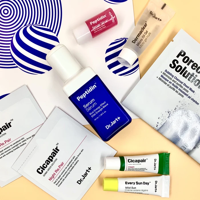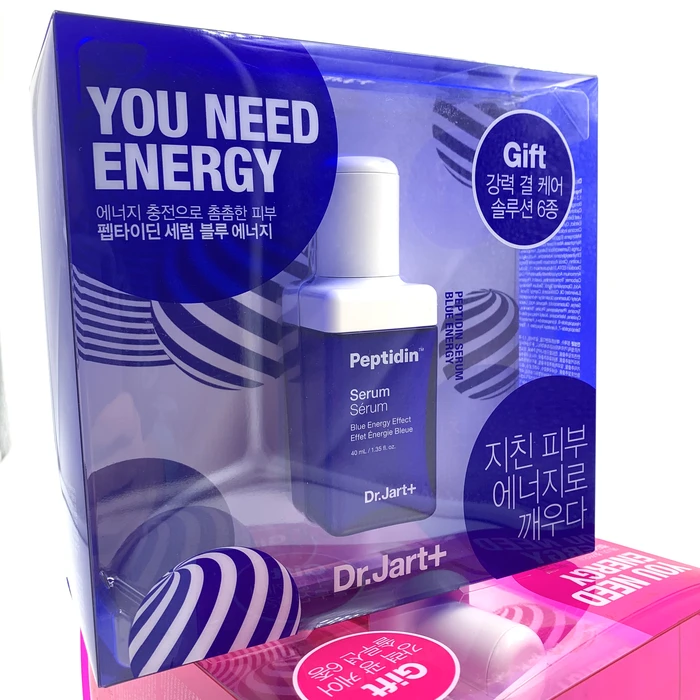 Набор косметических средств от производителя Dr.Jart+ вобрал в себя самые популярные средства, которые представлены в формате мини-версий, а также в наборе есть полноразмерная сыворотка с мощным пептидным комплексом Peptidin Serum Blue Energy. В мини-формате представлены: гель-масло для очищения кожи, уходовые ночной и дневной крема с экстрактом центеллы азиатской, универсальный солнцезащитный крем с SPF 43 PA+++, пептидная сыворотка с экстрактом персика, пузырьковая очищающая листовая маска.