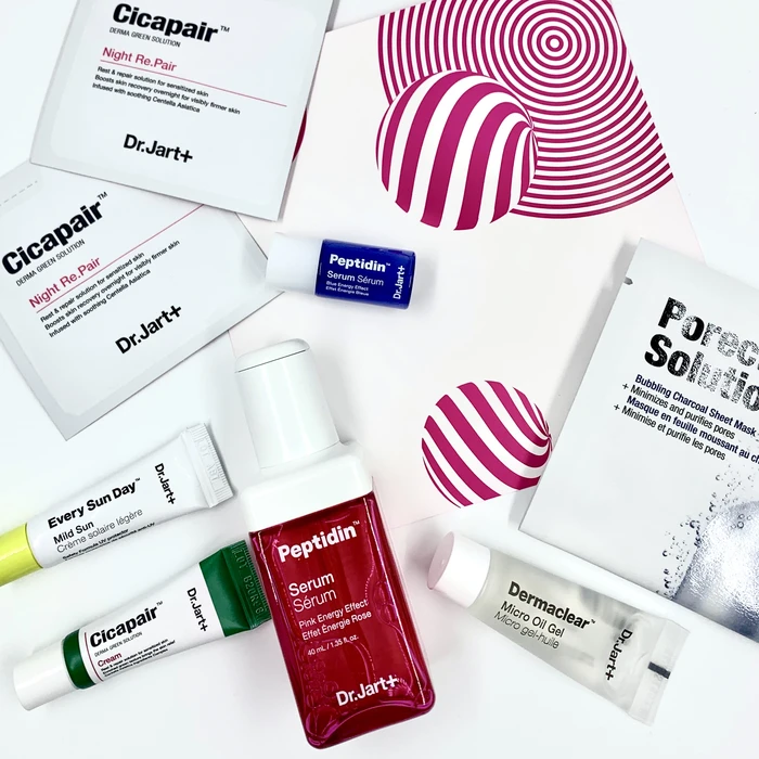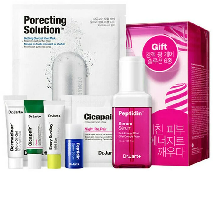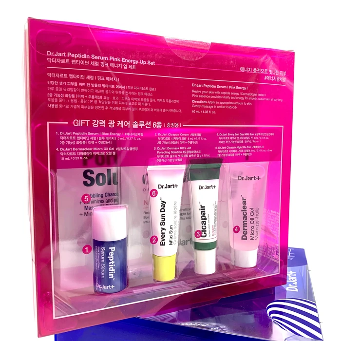 Набор средств от бренда Dr.Jart+ состоит из самых популярных средств в формате мини-версий, а также из полноразмерной пептидной сыворотки для лица Peptidin Serum Pink Energy. В мини-версиях представлено 6 косметических средств: увлажняющие дневной и ночной крем с экстрактом центеллы азиатской, солнцезащитный крем с SPF 43 PA+++, гель-масло для умывания, пептидная сыворотка для глубокого увлажнения, очищающая пузырящаяся листовая маска.