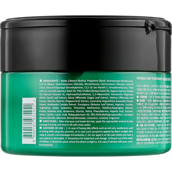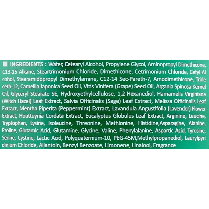 Water, Cetearyl Alcohol, Propylene Glycol, Aminopropyl Dimethicone, C13-15 Alkane, Steartrimonium Chloride, Dimethicone, Cetrimonium Chloride, Cetyl Alcohol, Stearamica Dimethylamine, C12-14 Sec-Pareth-7, Amodimethicone, Trideceth-12, Camelia Japonica Seed Oil, Grape Seed Oil, Argania Spinosa Kernel Oil, Glyceryl Stearate SE, Hydroxyethylcellulose, 1,2-hexandiol, Witch Hazel Leaf Extract, Sage Leaf Extract, Lavender Flower Extract, Melissa Leaf Extract, Peppermint Leaf Extract, Houttuynia Cordata Extract, Eucalyptus Globulus Leaf Extract, Arginine, Leucine, Tryptophan, Lysine, Isoleucine, Threonine, Methionine, Histidine, Asparagine, Alanine, Proline , Glutamic Acid, Glutamine, Glycine, Valine, Phenylalanine, Aspartic Acid, Tyrosine, Serine, Cystine, Lactic Acid, Polyquaternium-10, PEG-45V, Methylpropandiol, Laurylpyridinium Chloride, Allantoin, Benzyl Benzoate, Limonene, Linalool, Fragrance