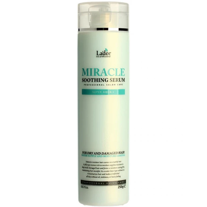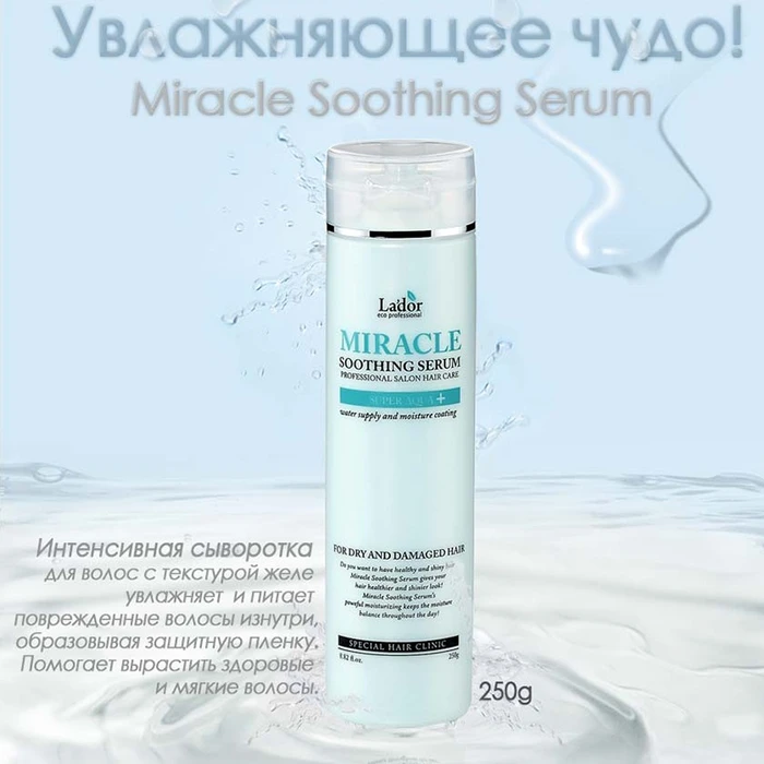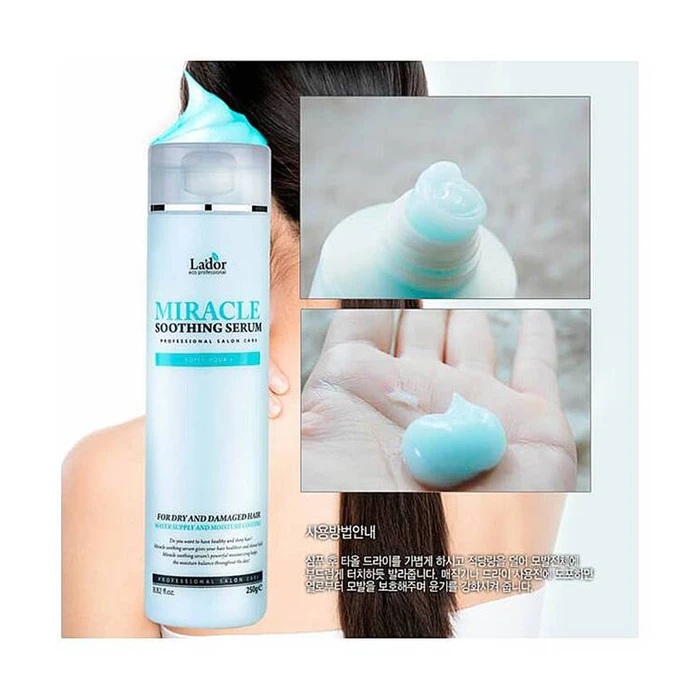 Увлажняющая сыворотка La'dor Miracle Soothing Serum с восстанавливающим и защитным эффектом наносится на тщательно вымытые, сырые волосы. Средство наносится на всю длину волос с уделением особого внимания поврежденным участкам локонов. Сыворотку не нужно смывать, так как после высыхания она не утяжеляет пряди.